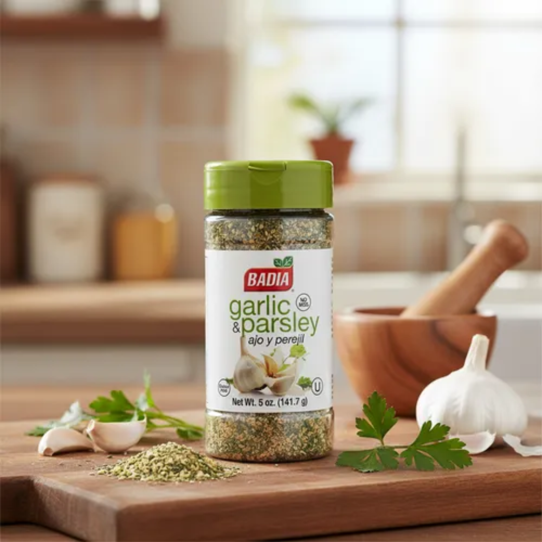 El Badia Garlic & Parsley es un condimento seco utilizado para sazonar una amplia variedad de platos. Combina ajo y perejil, dos ingredientes habituales en la cocina internacional, empleados tanto en recetas tradicionales como en preparaciones rápidas.