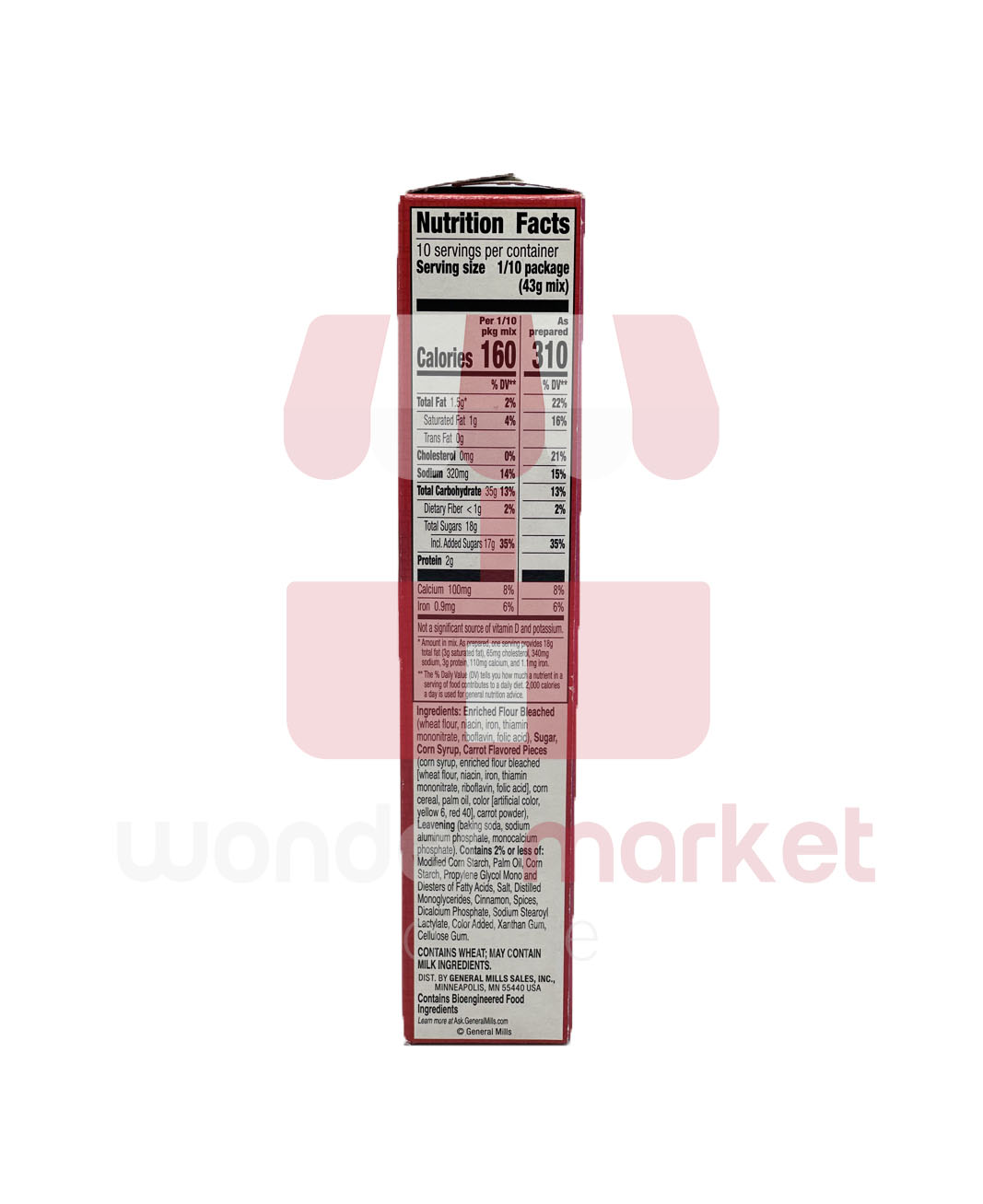 Ingredientes:  harina de trigo enriquecida, azúcar (azúcar y/o azúcar dorado, jarabe de maíz), harina de zanahorias (jarabe de maíz, harina de trigo enriquecida, copos de maíz, aceite de palma, caramelo como colorante, colorante E110-E129*, harina de malta de cebada), bicarbonato de sodio y fosfato de aluminio como levadura, almidón de maíz modificado, almidón de maíz, mono propilenglicol, sal, monoglicéridos, fosfato de calcio, especias, aceite de palma, fosfato de calcio, estearoil lactilato de sodio, goma de xantano, goma de celulosa, caramelo como colorante.