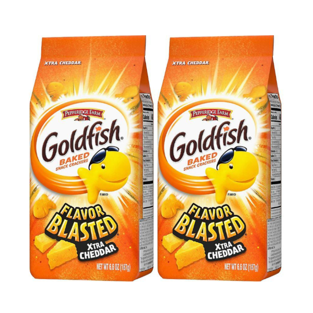 Aumenta tu apetito con Goldfish® Flavour Blasted®. Las galletas Goldfish® Flavour Blasted® Xtreme Cheddar están cargadas de un sabor explosivo, siempre horneadas y sin aromas artificiales.Ingredientes:Hecho con sonrisas y harina de trigo enriquecida (harina, niacina, hierro reducido, mononitrato de tiamina, riboflavina, ácido fólico), queso cheddar ([leche cultivada, sal, enzimas], annatto), aceites vegetales (canola, girasol y/o soja), sal, contiene 2% o menos de: azúcar, extracto de levadura, suero de leche, maíz Harina, Autolitis Extracto de levadura zada, levadura torula, extracto de pimentón (color), especias, apio, queso cheddar modificado con enzima (leche, cultivos, sal, enzimas), cebolla en polvo, ajo en polvo, ácido cítrico, ácido láctico, lactato de calcio, sabor natural, grasa de leche, fosfato monocálcico, bicarbonato de sodio. Contiene: Trigo, Leche.