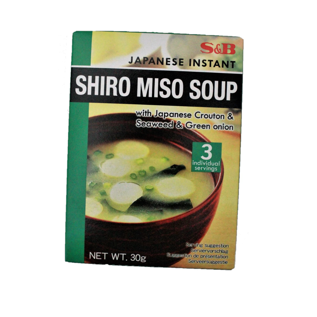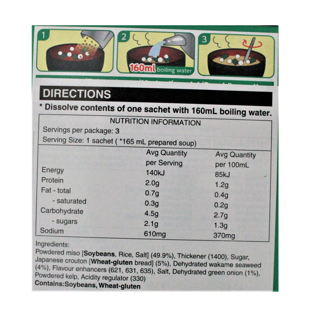 Ingredientes: Miso en polvo (alubias de soja, arroz, sal) 43.4%, dextrina, azúcar, pan tostado japonés (harina de trigo, proteína de trigo)5%, sal, alga wakame deshidratada 4%, potenciadores de sabor: E621, E631 y E635, extracto de levadura en polvo, cebolla verde deshidratada 1%, alga kelp en polvo, acidulante E330.