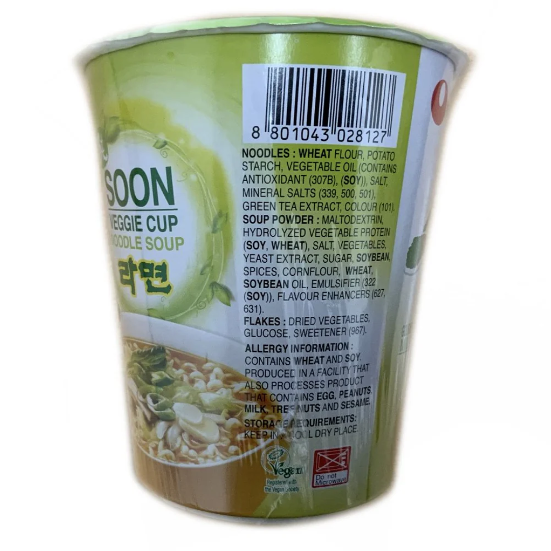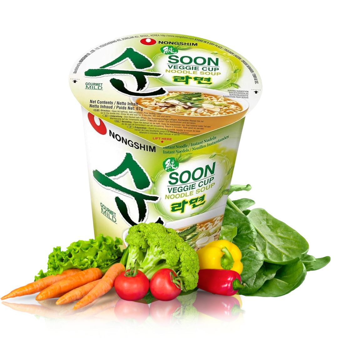 El Nongshim Soon Veggie Ramyun Cup de 67 g es una sopa instantánea coreana completamente vegetal y apta para veganos. Es perfecta para quienes quieren una comida rápida y deliciosa sin productos de origen animal. Su sabor es ligero y delicado.