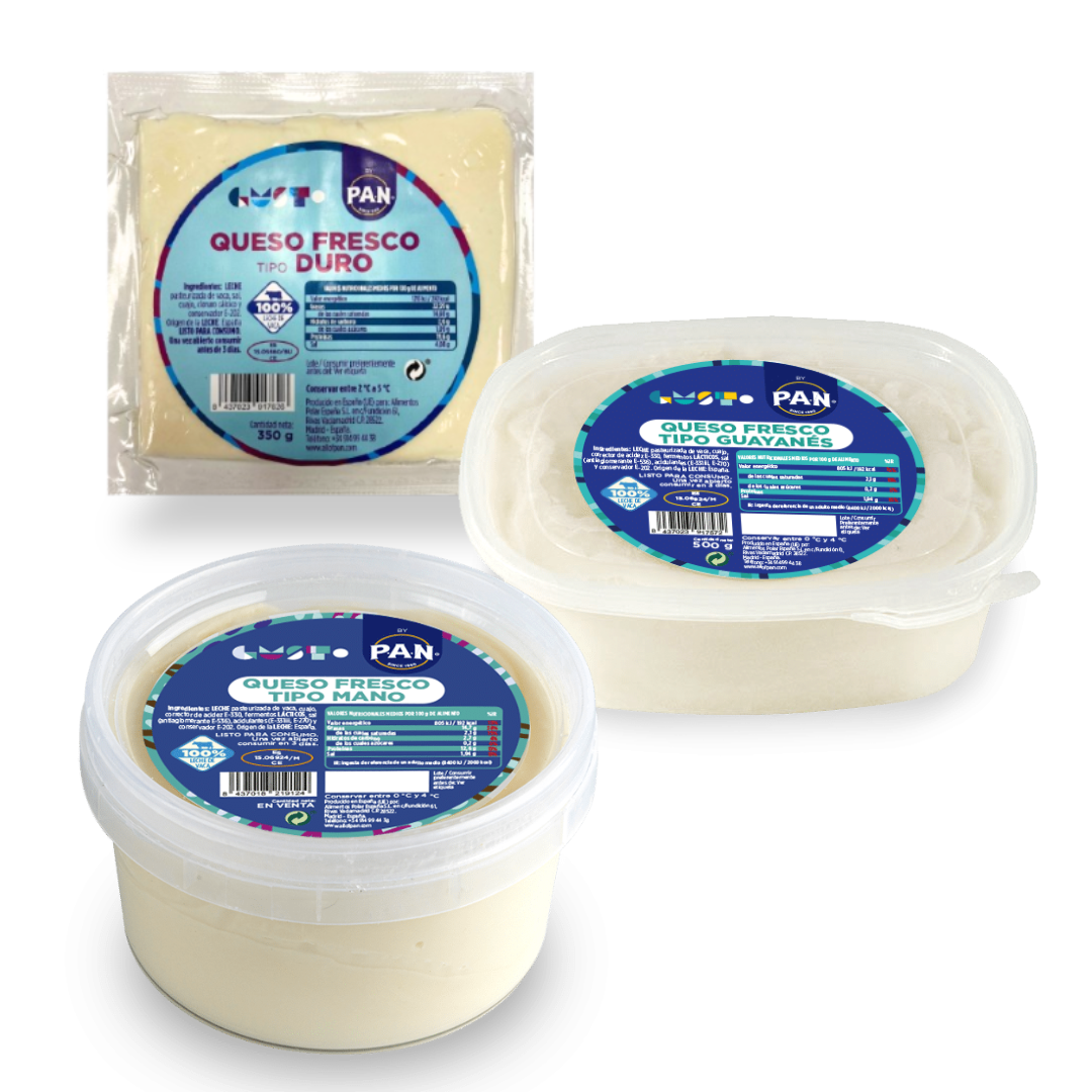 Este pack incluye queso duro, ideal para rallar sobre pastas, ensaladas o platos horneados; queso guayanés, suave y fresco, perfecto para desayunos, arepas y bocadillos; y queso de mano, cremoso y maleable, excelente para rellenar empanadas, tequeños o panes.